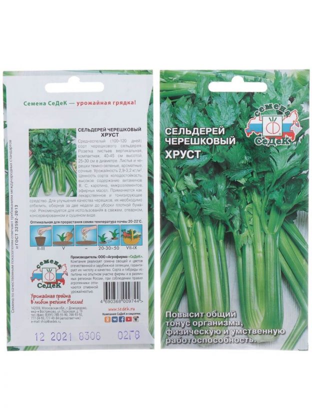 Среднеспелый (100-120 дней) сорт черешкового сельдерея. Розетка листьев вертикальная, компактная, 40-45 см высотой, 25-30 см в диаметре. Листья и черешки темно-зеленые, ароматные, сочные. Урожайность 2,9-3,2 кг/м2. Ценность сорта: холодостойкость, высокое содержание витаминов В, С, каротина, микроэлементов, эфирных масел. Применяется как лекарственное и тонизирующее средство. Для улучшения качества черешков, их необходимо отбелить, обернув за две недели до уборки плотной бумагой. Рекомендуется для использования в свежем, отварном, консервированном и сушеном виде.