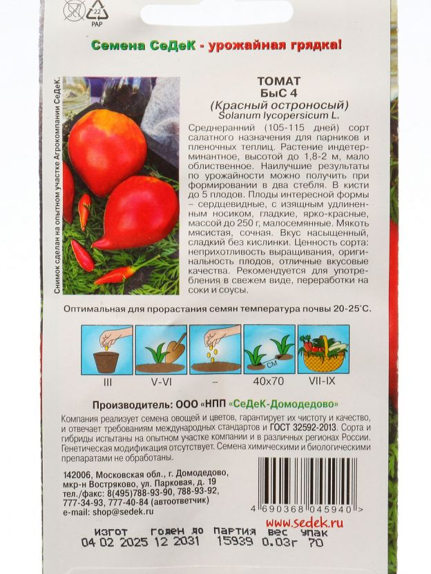Семена томата БыС 4 от Седек в цветной упаковке — идеальный выбор для стабильного урожая на даче или в домашних условиях. Среднеранний сорт, проверенный российскими огородниками.