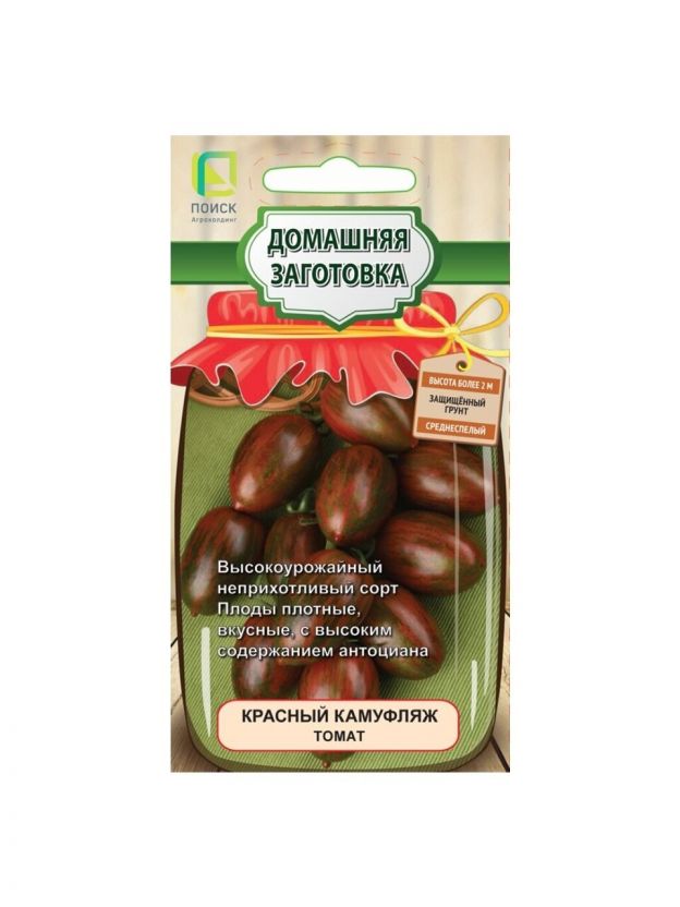 Семена томата Красный Камуфляж - это индетерминантный среднеспелый сорт для выращивания в защищенном грунте. Период от всходов до созревания 110-120 дней. Растение высокорослое, компактное, нуждается в подвязке и формировании, великолепно завязывает плоды в стрессовых условиях. Плоды массой 80-100 г, овальные, гладкие, плотные, в кисти по 6-8 штук.