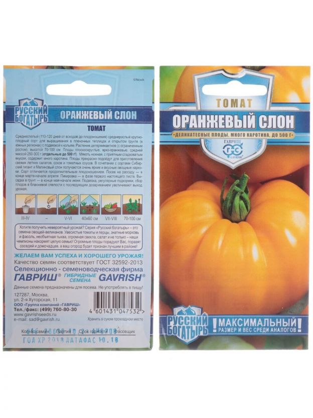 Семена Томат, Оранжевый слон, 0.05 г, Русский богатырь, цветная упаковка, Гавриш