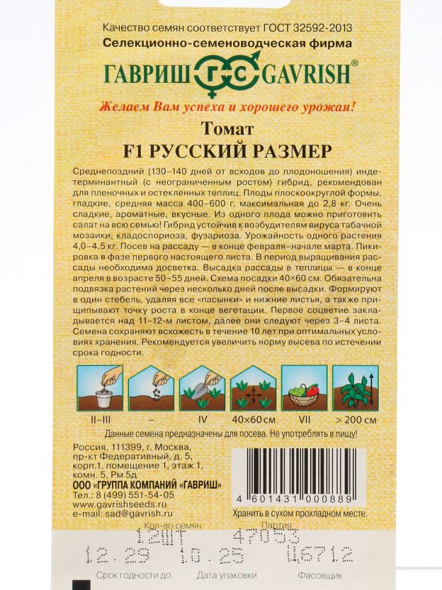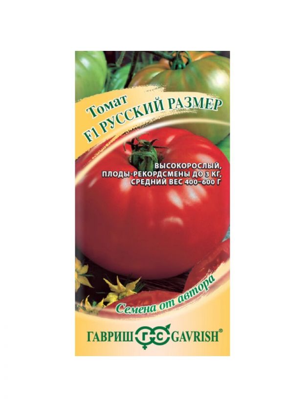 Семена Томат Русский размер F1 12 шт. — урожай до 8 кг с куста, крупные плоды для домашней и дачной теплицы. Авторская серия Гавриш, свежесть и всхожесть гарантированы.