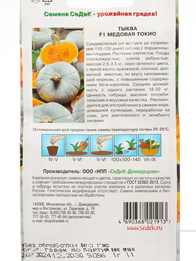 Упаковка содержит семена тыквы в цветной защитной обложке. Производитель — Седек, страна продавца: Россия.