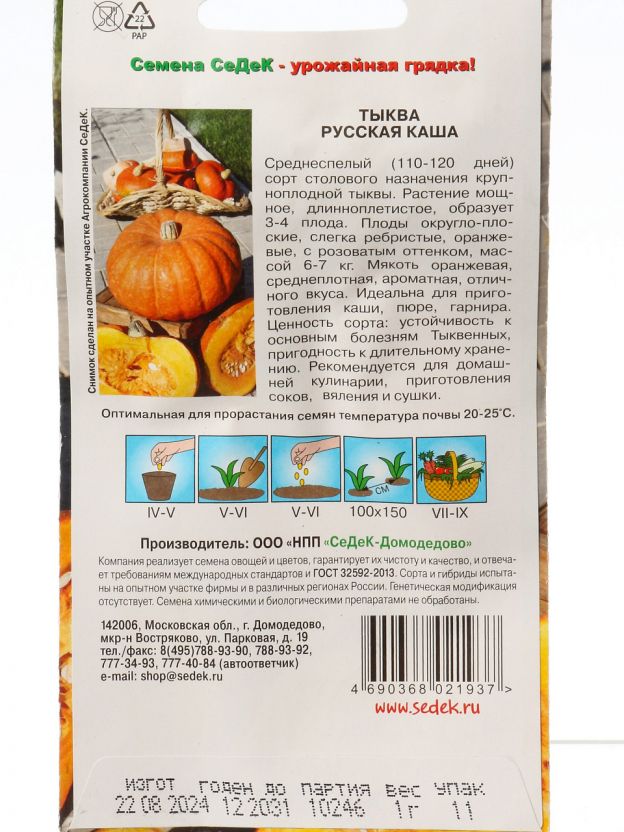 Семена тыквы «Русская каша» бренда Седек — это отличное решение для тех, кто ищет, какую тыкву выбрать для приготовления полезных блюд и зимних заготовок. Среднеспелый сорт адаптирован для российского климата, подходит для выращивания на даче или в частном хозяйстве. Цветная упаковка защищает семена от света, обеспечивая лучшую всхожесть.