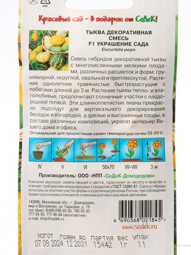 Семена тыквы "Украшение сада F1" от Седек — оптимальный выбор для тех, кто ищет купить недорого семена декоративной тыквы для дачи или дома. Этот сорт отличается не только средними сроками созревания, но и высокой декоративностью, что позволяет использовать плоды для украшения интерьера, создания композиций и оформления участка. Часто спрашивают: "Как использовать семена тыквы для декора?" — благодаря насыщенной окраске и необычной форме, плоды идеально подходят для осенних композиций, поделок и даже фотозон.