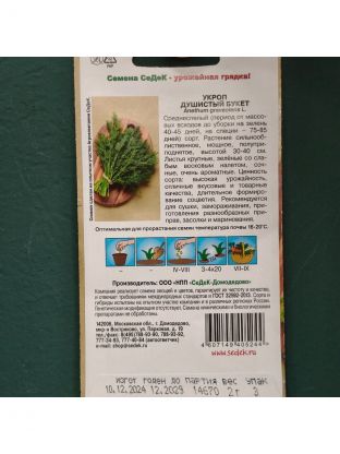 Семена укропа Душистый букет – это среднеспелый сорт. Период от массовых всходов до уборки на зелень 40-45 дней, на специи – 75-85 дней. Растение сильнооблиственное, мощное, полуприподнятое, высотой 30-40 см. Листья крупные, зелёные со слабым восковым налетом, сочные, очень ароматные.