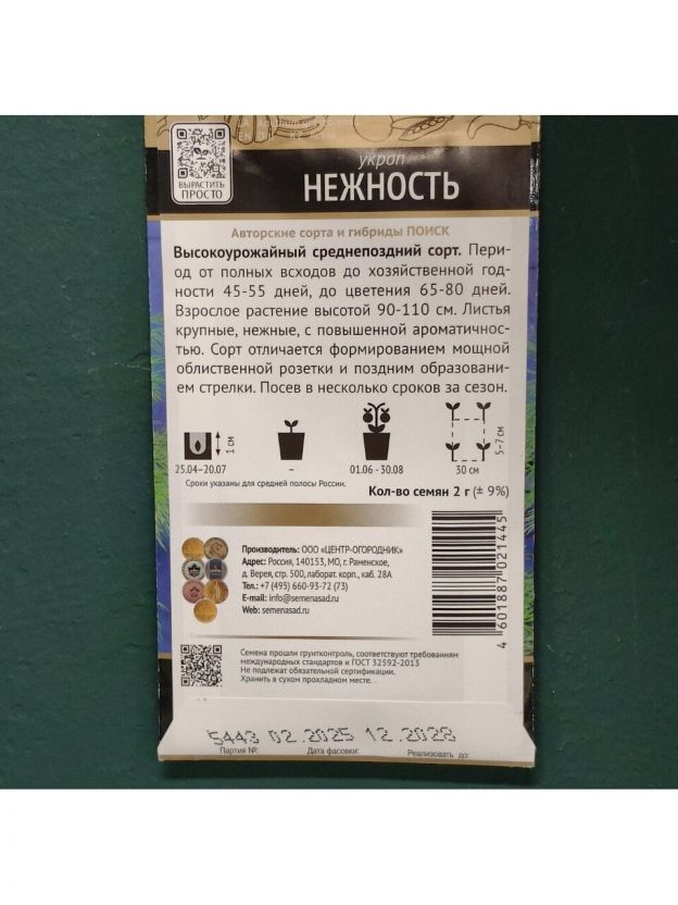 Семена укропа Нежность – это высокоурожайный среднепоздний сорт. Период от полных всходов до хозяйственной годности 45-55 дней, до цветения 65-80 дней. Взрослое растение высотой 90-110 см. Листья крупные, нежные, с повышенной ароматичностью, окраска темно-зеленая. Сорт отличается формированием мощной облиственной розетки и поздним образованием стрелки.