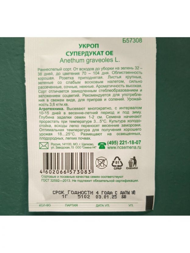 Семена укропа Супердукат ОЕ – это среднеспелый сорт. Период от полных всходов до хозяйственной годности 41-51 дней. Листья крупные, сильнорассеченные, сочные, нежные.