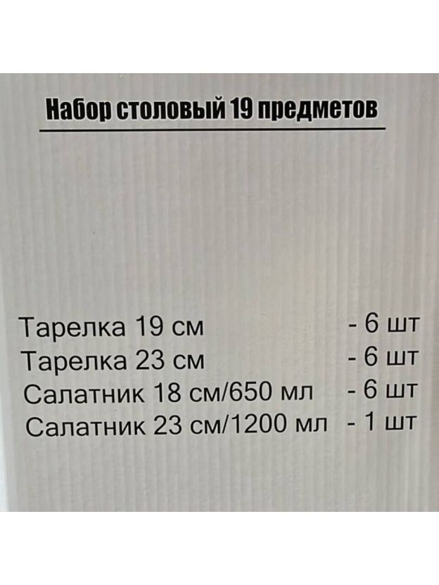 В комплект входит 19 предметов: 6 плоских тарелок 19 см, 6 обеденных тарелок 23 см, 6 салатников 18 см (650 мл), 1 салатник 23 см. Общий вес — 6,2 кг.