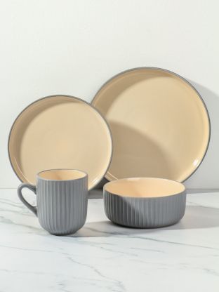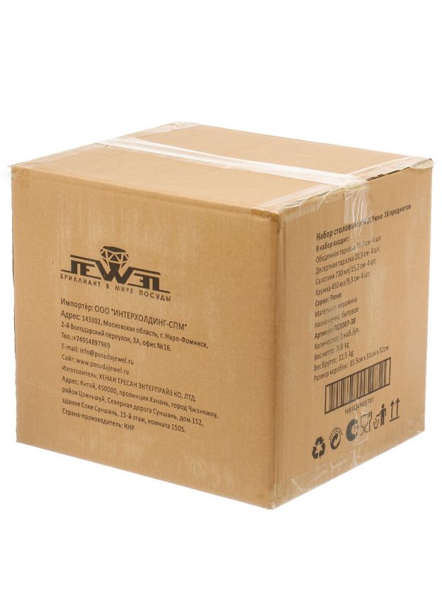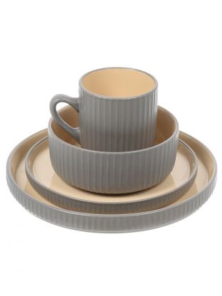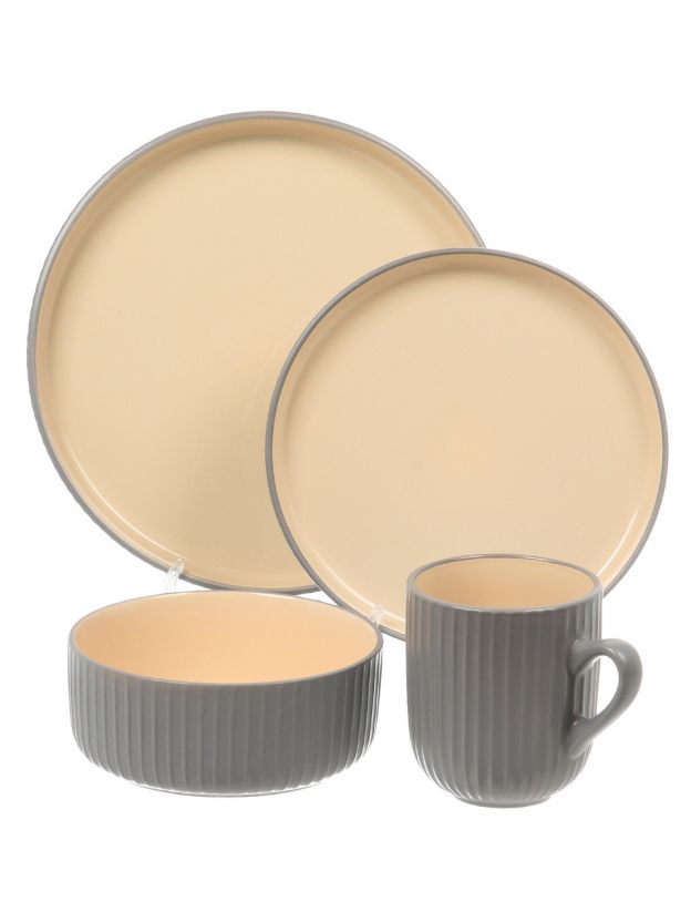 В наборе 16 керамических предметов на 4 персоны. Цвет — серый, материал — керамика, можно использовать в СВЧ и мыть в посудомойке. Производитель — бренд Jewel, модель Рюне (артикул ПС0007-38), страна — Китай.