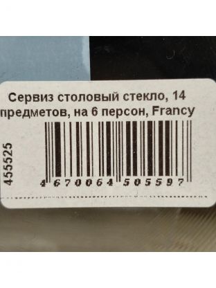 В комплекте 14 предметов, рассчитан на 6 персон. Вес набора — 5,5 кг, материал — голубое стекло, коллекция Francy diamond, артикул 50559.