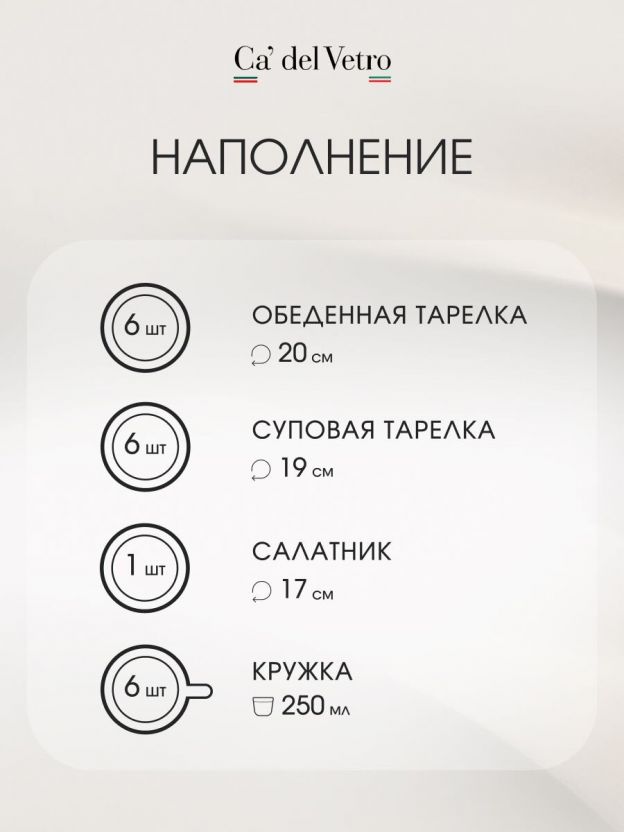 Сервиз рассчитан на 6 персон, включает 19 предметов, общий вес — 6,8 кг, что удобно для хранения и транспортировки.