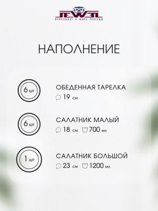 В наборе 13 предметов, рассчитанных на 6 персон — оптимально для сервировки домашнего или праздничного стола.