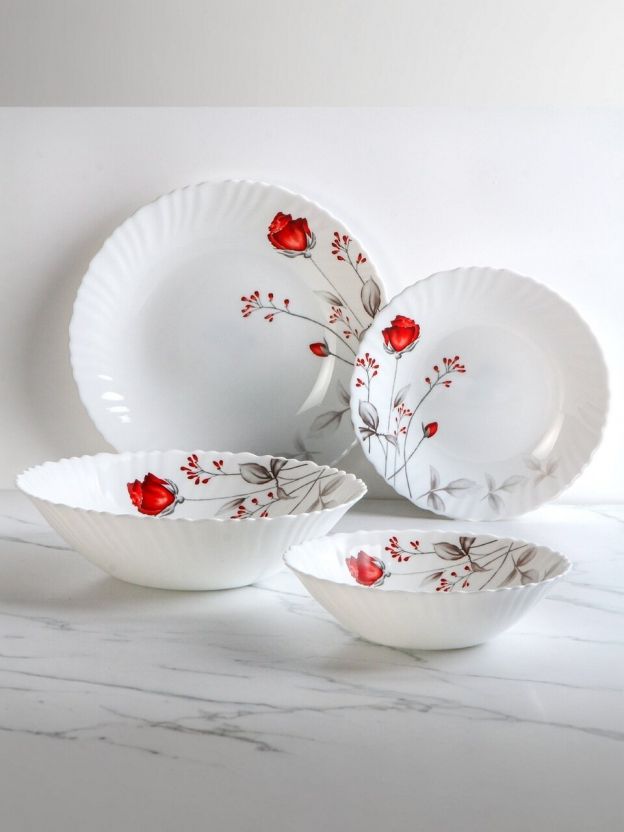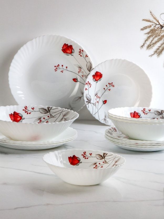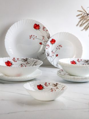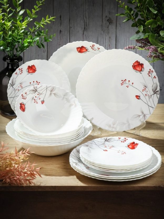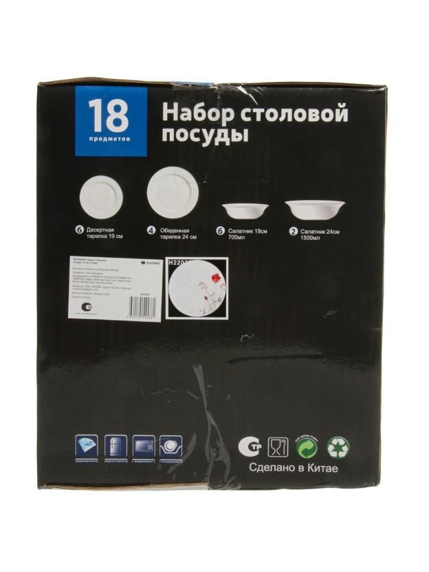 В комплекте 18 предметов из белой стеклокерамики, вес набора — 6 кг, подходит для СВЧ и посудомоечной машины, страна производства — Китай.