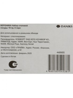 Сервиз столовый стеклокерамика, 18 предметов, на 6 персон, Daniks, Вероника