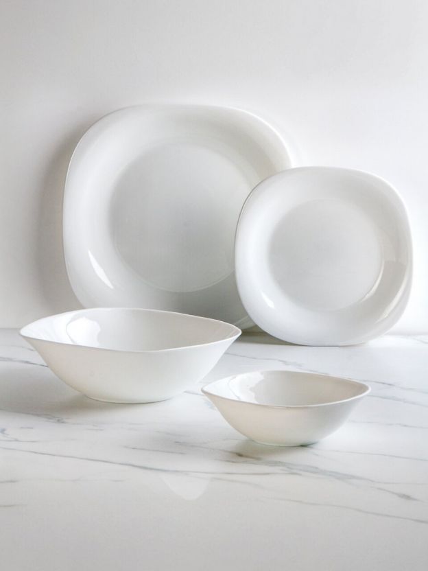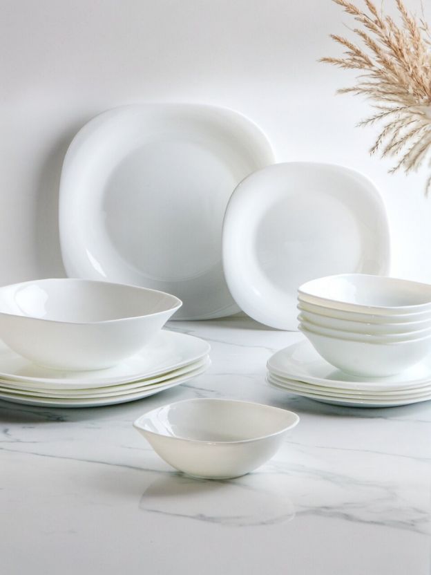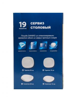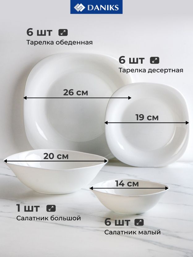Сервиз столовый Daniks Белый Квадро на 6 персон — 19 предметов из прочной стеклокерамики: элегантный дизайн, подходит для СВЧ и посудомойки, идеален для подарка или дома.