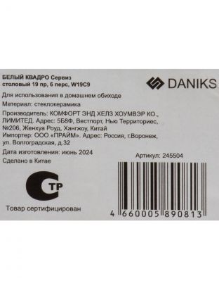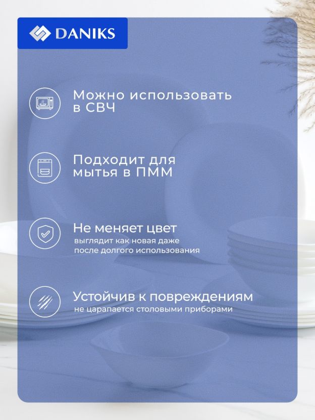 Часто спрашивают: «Как выбрать сервиз для семьи?», «Подходит ли для микроволновки?», «Что лучше — стеклокерамика или фарфор?» В отличие от аналогов, стеклокерамика Daniks легче фарфора, не требует особого ухода и выдерживает перепады температур. Все предметы можно мыть в посудомоечной машине и использовать в микроволновой печи — это экономит время и силы. В комплекте 19 предметов: тарелки разного размера, суповые и десертные блюда — достаточно для полноценной сервировки на 6 человек.
