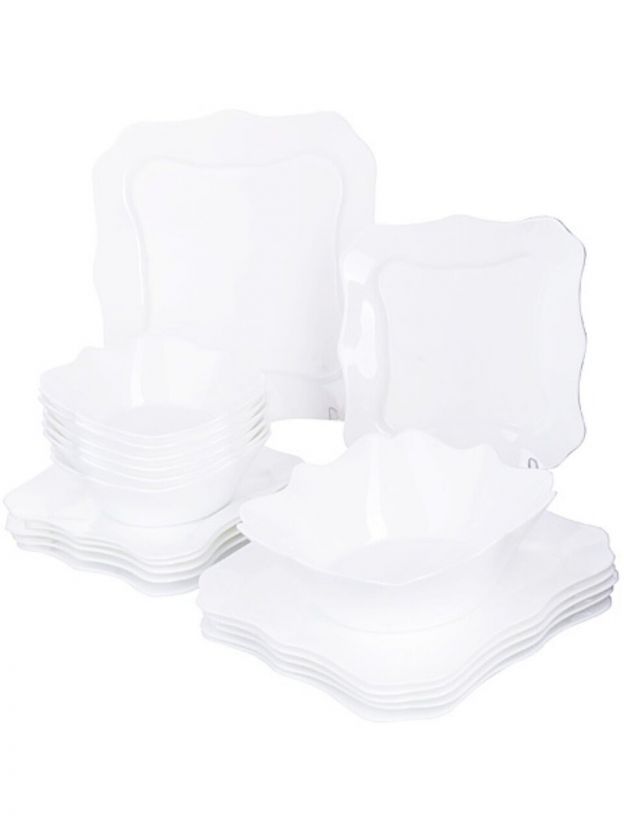 В наборе 19 предметов, рассчитан на 6 персон. Вес комплекта — 7 кг, материал — белая стеклокерамика.