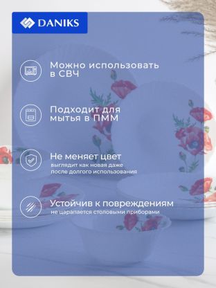 Сервиз Daniks «Алый мак» — это 24 предмета из прочной стеклокерамики, рассчитанные на 6 персон. Благодаря термостойкости сервиз можно использовать в микроволновой печи и мыть в посудомоечной машине, что особенно важно для современных семей и занятых людей. Если вы ищете, какой столовый сервиз выбрать для дома или дачи, обратите внимание на долговечность стеклокерамики: она легче фарфора, не впитывает запахи и устойчива к сколам.