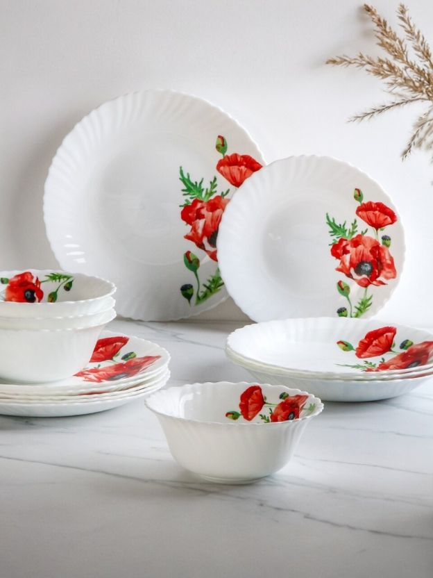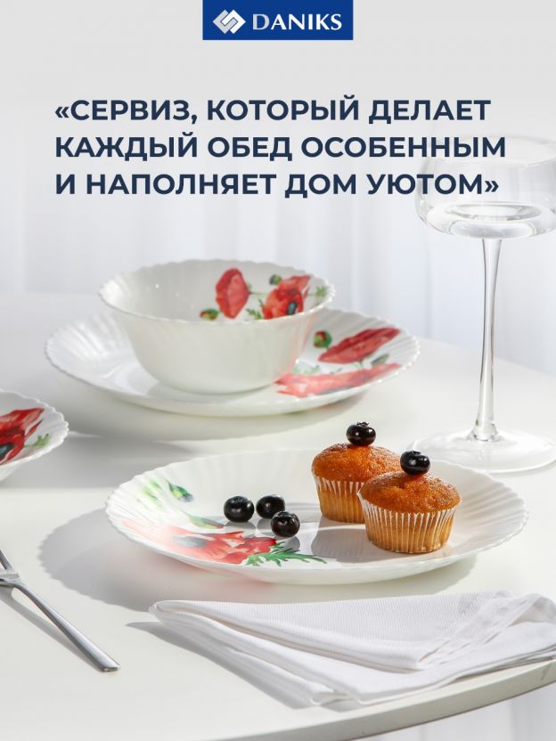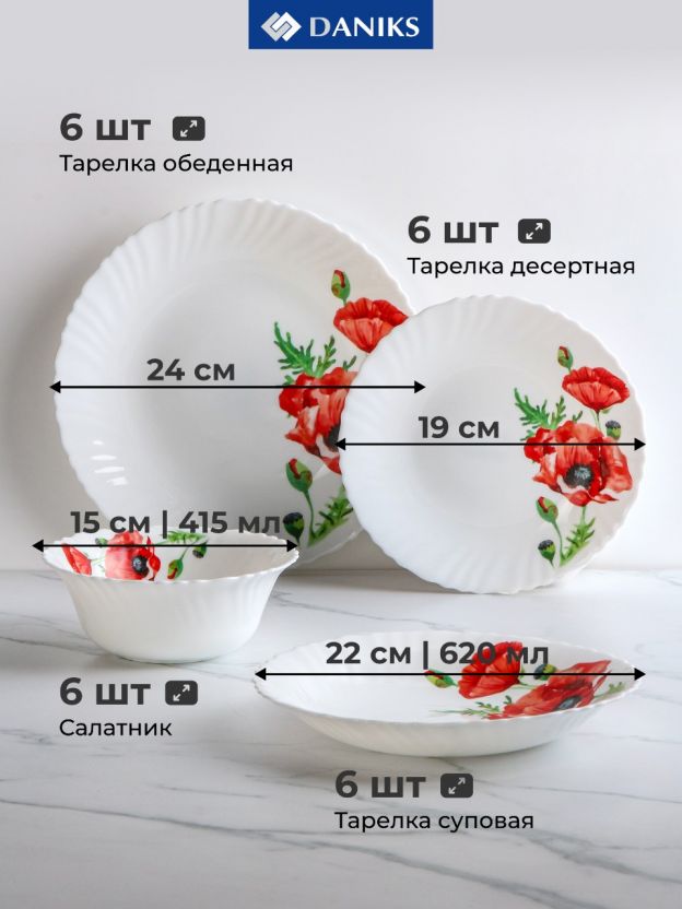 Сервиз столовый из стеклокерамики Daniks «Алый мак», 24 предмета на 6 персон: стильный подарок, практичное решение для дома и дачи, подходит для СВЧ и посудомоечной машины.