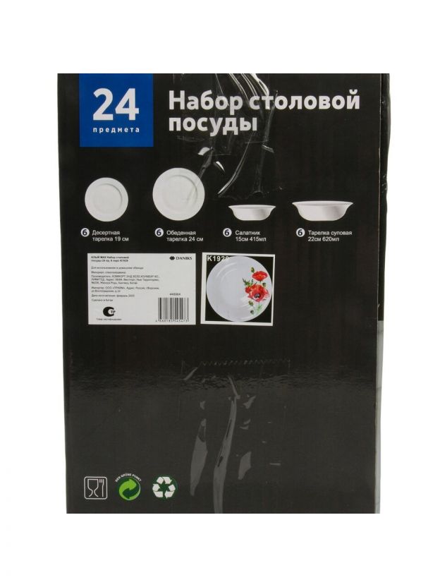 В комплекте 24 предмета на 6 персон: тарелки, суповые миски и другие необходимые элементы для полноценной сервировки.