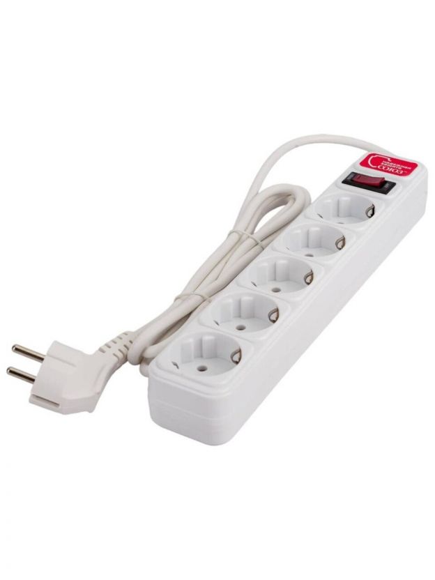 Сетевой фильтр 5 гнезд, 1.8 м, ПВС, 3х0.75 мм2, с заземлением, 10 А, белый, Союз, 13401