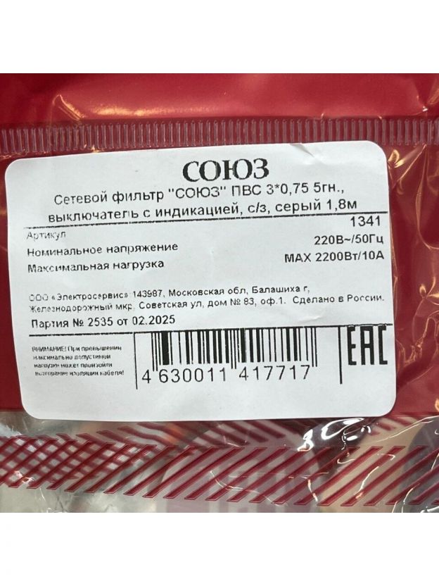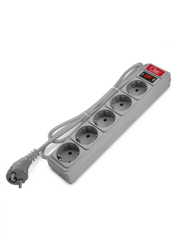 Сетевой фильтр 5 гнезд, 1.8 м, ПВС, 3х0.75 мм2, с заземлением, 10 А, серый, Союз, 134101