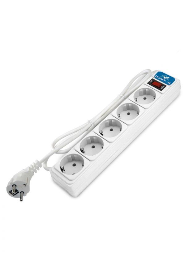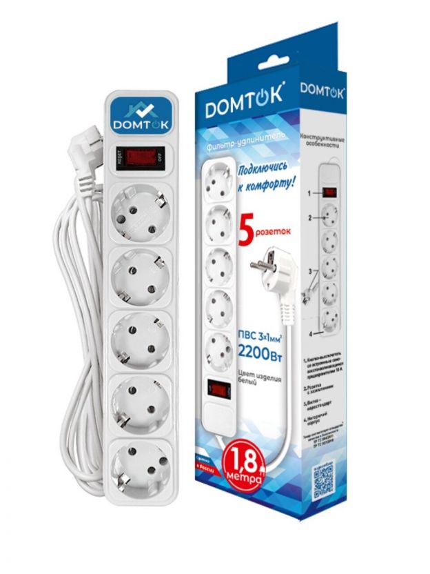 Сетевой фильтр Domtok 2527: 5 розеток, 1.8 м, заземление, выключатель с индикацией — безопасное подключение для дома и дачи по выгодной цене.