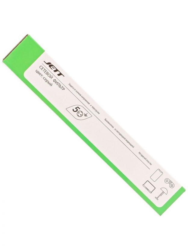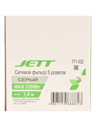 Сетевой фильтр 5 гнезд, 1.9 м, 3х0.75 мм2, с заземлением, 10 А, 2.2 кВт, серый, Jett, 171-002
