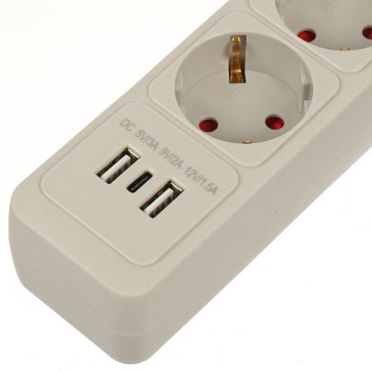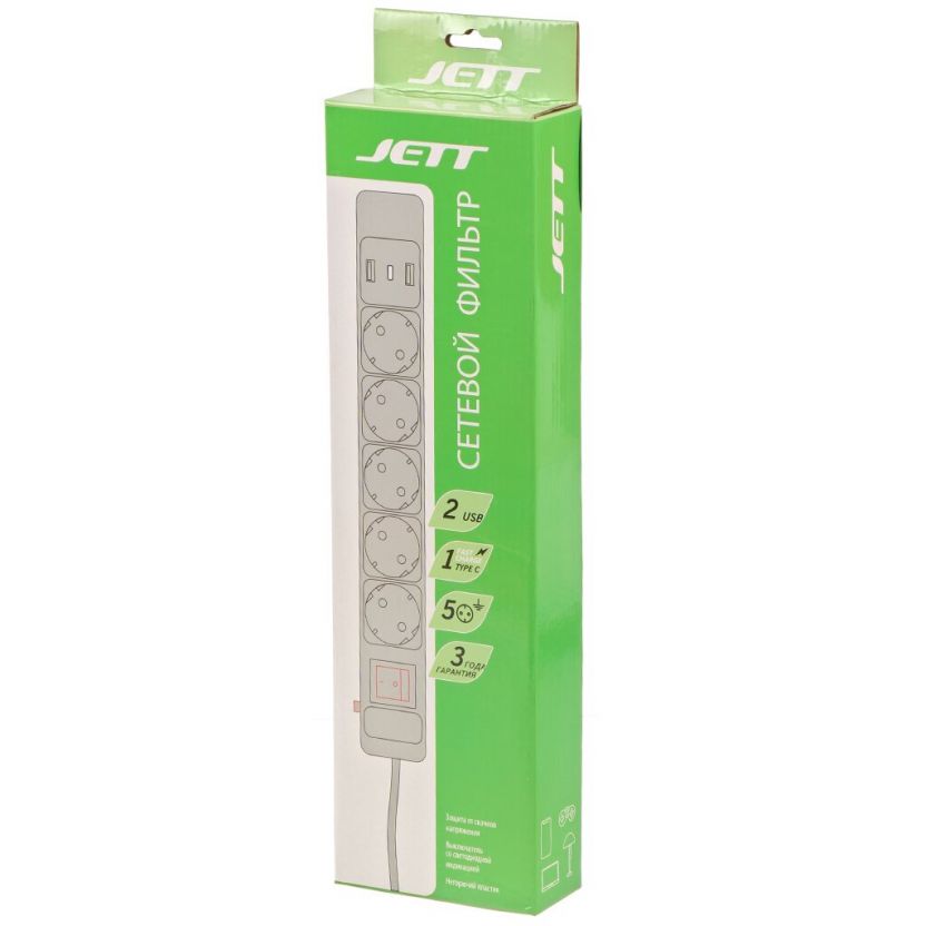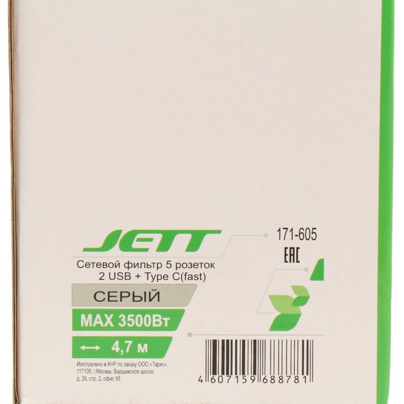 Сетевой фильтр 5 гнезд, 4.7 м, ПВС, 3х1 мм2, с заземлением, 16 А, +2USB +TYPE C 2.0, 3.5 кВт, серый, Jett, 171-605