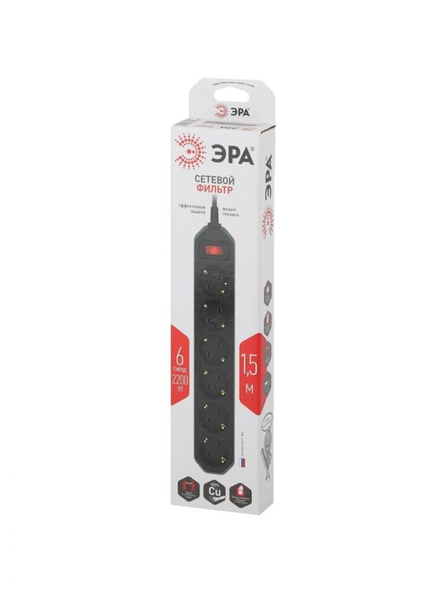 Сетевой фильтр разработан собственными инженерами компании ЭРА, проходят проверку на всех этапах производства, гарантируя высокое качество его исполнения. Длина провода модели составляет 1,5 метра. Удлинитель удобно использовать в пределах одной комнаты. Сетевой фильтр имеет кольцо на шнуре, благодаря чему прибор можно быстро выдернуть из сети.