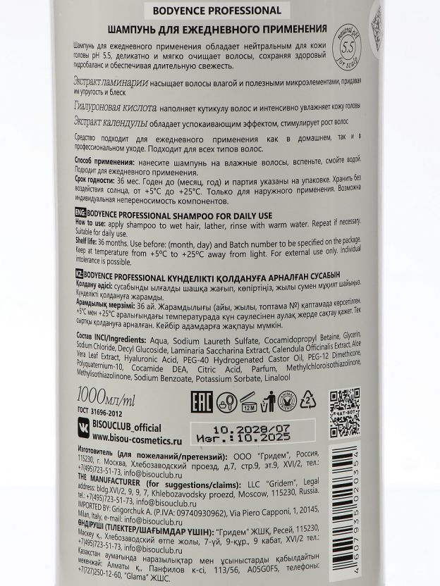 Шампунь Bodyence 1000 мл — универсальное решение для ежедневного ухода за всеми типами волос: мягкое очищение, здоровый блеск и экономичный формат. Почему выбирают: Подходит для всей семьи — оптимальная формула для любого типа волос без пересушивания и утяжеления Большой объём 1000 мл — удобно для частого использования дома, в спортзале или салоне Идеален для ежедневного применения — экономит время и бюджет, подходит для подарка и дачи Шампунь Bodyence для ежедневного применения — это универсальный продукт, который легко впишется в любой ритм жизни. Благодаря сбалансированному составу, он мягко очищает волосы и кожу головы, не вызывая раздражения и сохраняя естественный баланс влаги. Если вы ищете, какой шампунь выбрать для всей семьи или для разных типов волос, Bodyence — оптимальный выбор: его формула подходит и для сухих, и для жирных, и для нормальных волос. В отличие от аналогов с агрессивными ПАВ, этот шампунь не пересушивает волосы, а большой объём 1000 мл позволяет экономить, используя средство ежедневно дома или на даче. Часто спрашивают, можно ли использовать шампунь Bodyence каждый день и подходит ли он для окрашенных или тонких волос — да, продукт протестирован дерматологами и не содержит агрессивных компонентов. Если вы ищете, что лучше для регулярного ухода, обратите внимание на универсальность и экономичность Bodyence. Выбирайте шампунь Bodyence и получайте профессиональный уход по выгодной цене — оформите заказ сейчас и оцените качество, подтверждённое экспертами и отзывами покупателей. Частые вопросы: Можно ли использовать шампунь Bodyence для всех типов волос? Да, формула разработана для ежедневного применения и подходит для сухих, жирных, нормальных и комбинированных волос, не нарушая их структуру. Чем выгоден большой объём 1000 мл? Экономичный формат позволяет использовать шампунь всей семьёй или в профессиональных целях, снижая расходы и частоту покупок. Подходит ли шампунь Bodyence для чувствительной кожи головы? Да, средство не содержит агрессивных компонентов и протестировано дерматологами, подходит для ежедневного мягкого ухода.