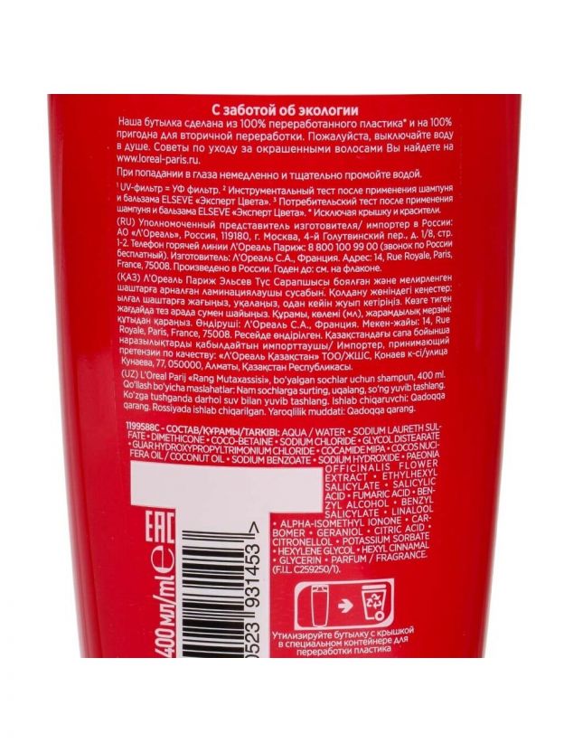 Выбирая данный шампунь, покупатель получает возможность продлить насыщенность цвета, снизить частоту окрашивания и сохранить здоровье волос. Продукт идеально впишется в повседневную рутину ухода, а его эффективность порадует результатом уже после первого применения. Отличное решение для тех, кто ценит качество, заботится о внешнем виде и желает подчеркнуть индивидуальность с помощью ярких, ухоженных волос. Шампунь L'Oreal Elseve, Эксперт цвета, 400 мл – залог уверенности в безупречном состоянии волос каждый день.