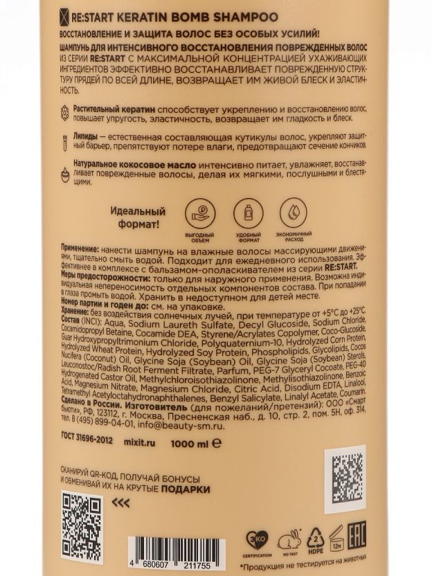 Если вы ищете, какой шампунь лучше выбрать для повреждённых волос, обратите внимание на Mixit Re:Start Keratin Bomb — он сочетает экспертный состав, экономичный расход и универсальность. Средство хорошо работает после окрашивания, химической завивки, термоукладки, а также для профилактики ломкости.