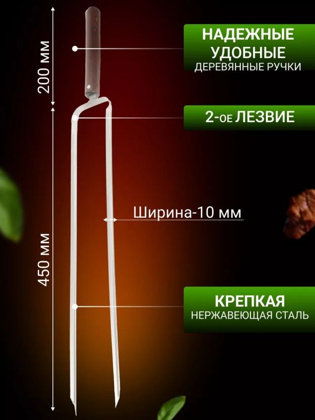 Шампур лезвие двойное, 650х450х12х2 мм, нержавеющая сталь, рукоятка лакированое дерево, 2К-386