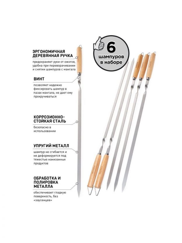 Набор шампуров станет отличным дополнением к вашему инвентарю для барбекю и гриля. Благодаря ему вы сможете проводить время на природе и наслаждаться вкусной едой, приготовленной на открытом огне. А благодаря количеству шампуров в наборе вы сможете сэкономить время и силы, необходимые для готовки.