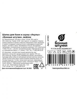 Шапка для бани 50% шерсть, 50 % полиэстер, Банные штучки, Акулы, 41503