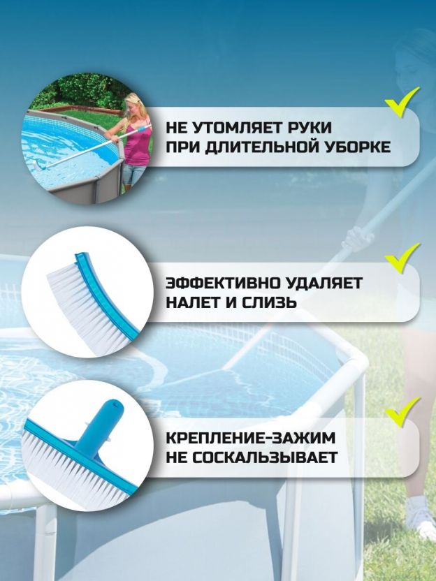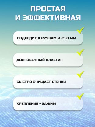 Щетка имеет прочное крепление «зажим», что обеспечивает надежное соединение с телескопической ручкой. Она подходит для телескопической ручки с внутренним диаметром 29,8 мм, а также совместима с ручкой Intex 29055. Это позволяет легко адаптировать щетку к различным условиям использования, обеспечивая удобство и эффективность при чистке бассейна.