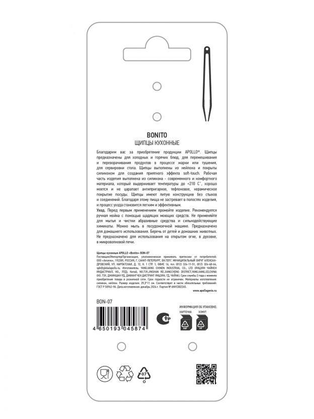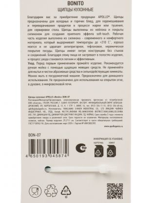 Щипцы кухонные, нейлон, 2.3х9.3х31 см, навеска, Apollo, Bonito, BON-07
