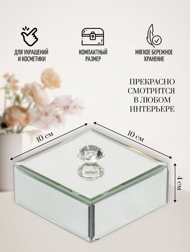 • Компактные размеры 10х10х4 см подходят для хранения колец, серёжек, цепочек; стекло устойчиво к царапинам и не впитывает запахи.