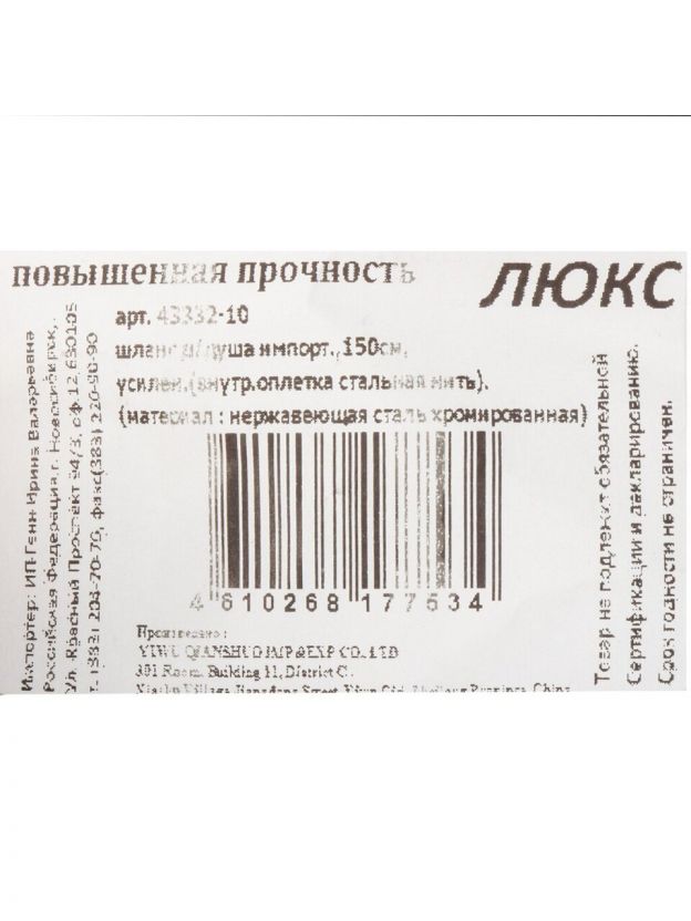 Шланг изготовлен из нержавеющей стали, что гарантирует долгий срок службы и защиту от коррозии даже при постоянном контакте с водой. Классическое подключение ИМП-ИМП обеспечивает совместимость с большинством современных душевых систем, а индивидуальная упаковка сохраняет товар в безупречном состоянии до момента установки. Страна-производитель — Китай, что подтверждает оптимальное сочетание качества и доступной цены.