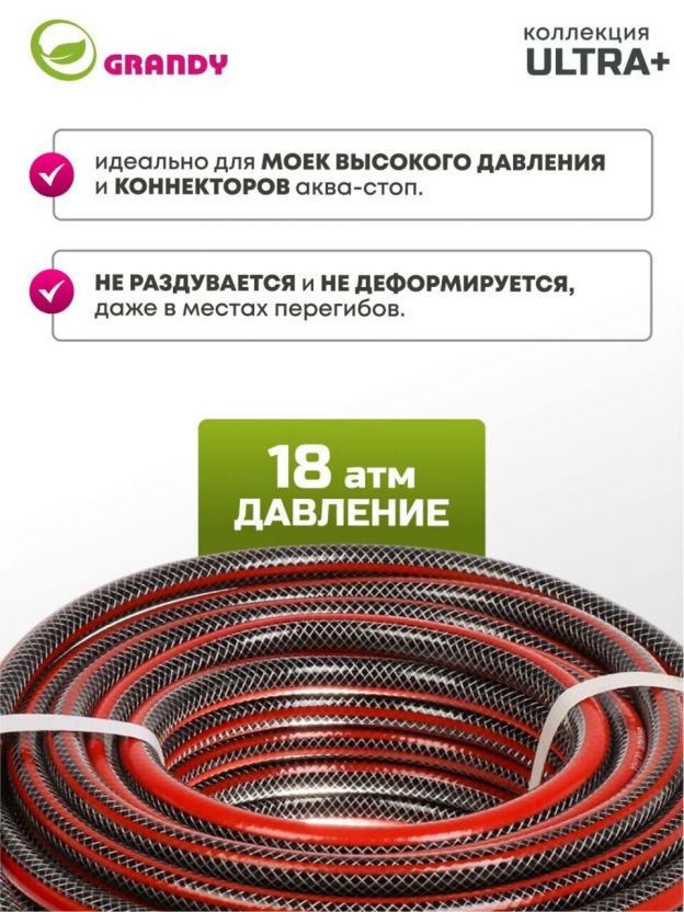 Шланг поливочный армированный трехслойный Grandy Ultra+ не подвержен локальным вздутиям, не образует трещин и изломов. Проверен на герметичность, концы шланга запаяны под давлением.