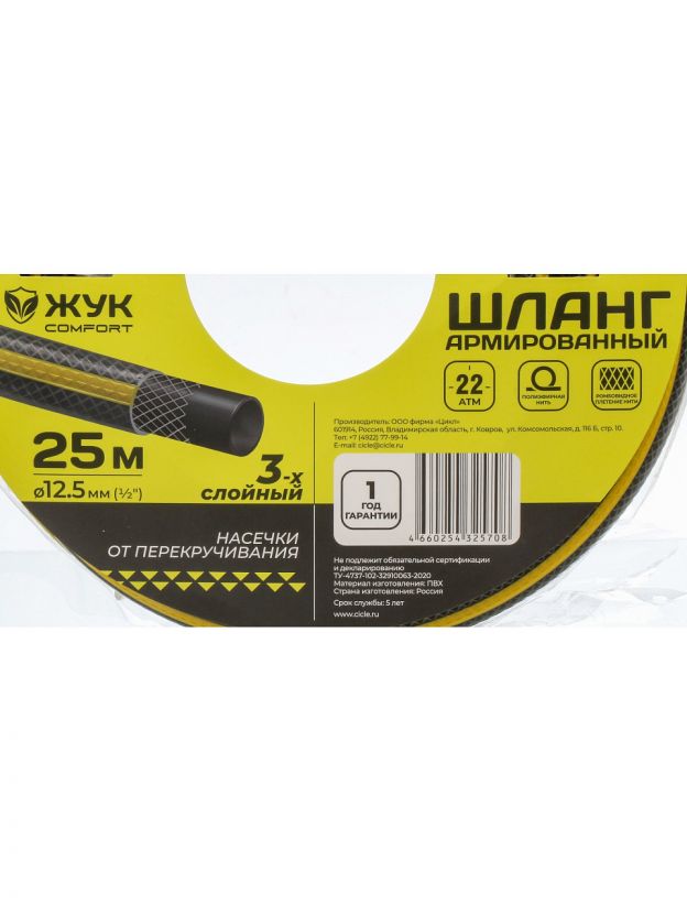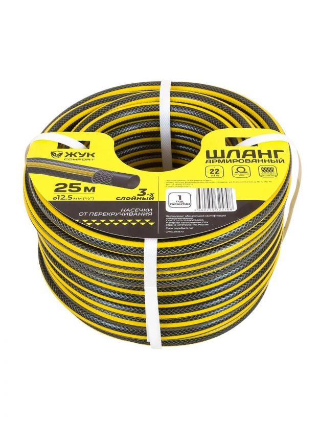 Шланг поливочный, 1/2 '', внутренний d12.5 мм, 22 атм, 25 м, 3 слоя, Жук, Comfort, ПВХ, желтый