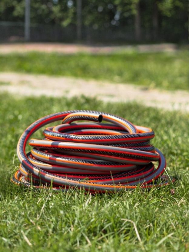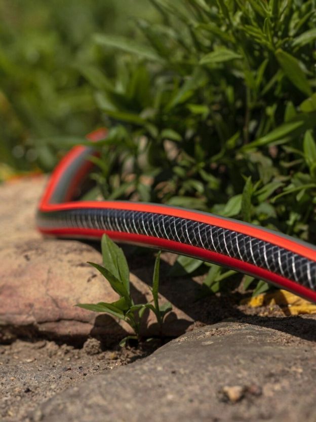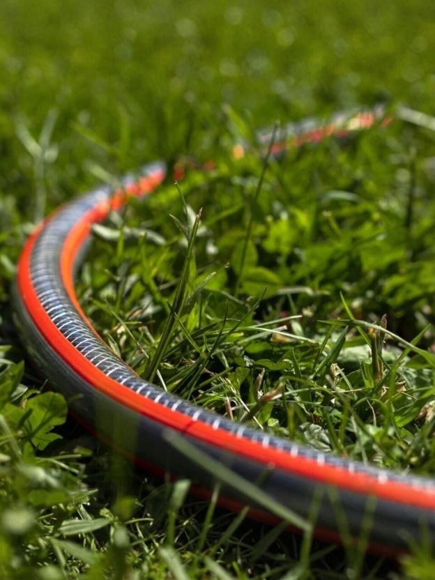 - Длина шланга составляет 25 метров, что делает его идеальным инструментом для полива садовых участков и транспортировки различных жидкостей, включая пищевые продукты.