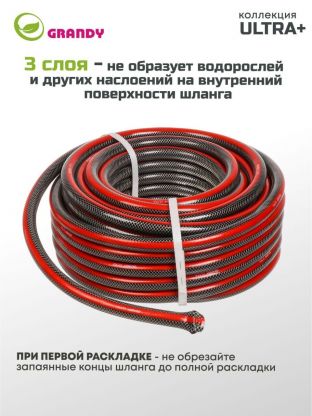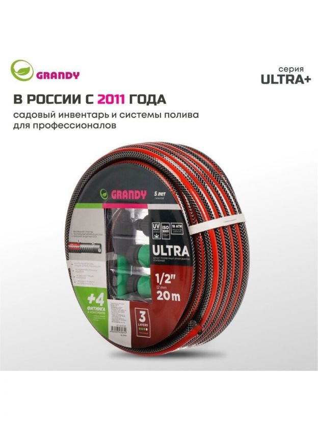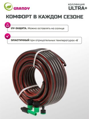 Шланг поливочный армированный трехслойный Grandy Ultra+ не подвержен локальным вздутиям, не образует трещин и изломов. Проверен на герметичность, концы шланга запаяны под давлением. Шланг соответствует стандарту ISO 9001. Устойчив к прямым солнечным лучам и ультрафиолетовому излучению. Устойчив к коррозии и истиранию, не токсичен и не содержит солей кадмия. Не образует водорослей и других наслоений на внутренних поверхностях шланга. Допустимые температурные значения: от -5°С до +65°С. В комплект поставки входят дополнительные фитинги для шланга.