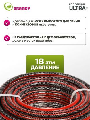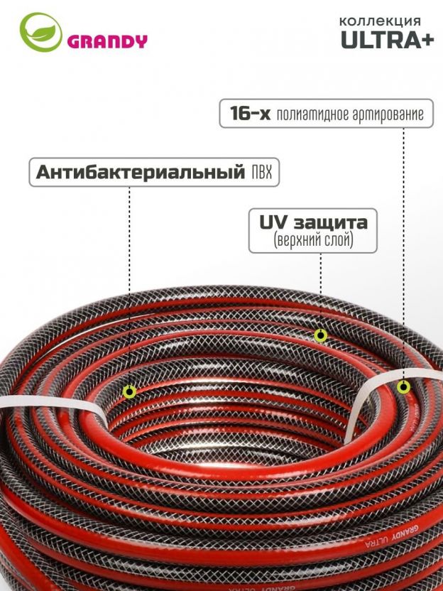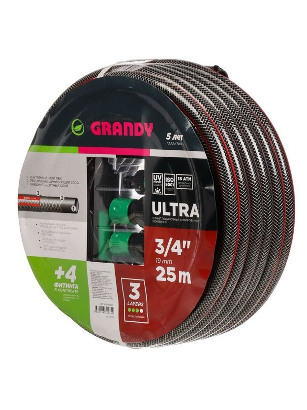 Шланг поливочный, 3/4 '', 19 мм, 18 атм, армированный, 25 м, 3 слоя, Grandy, Ultra+, ПВХ, с фитингами, AGL063425F