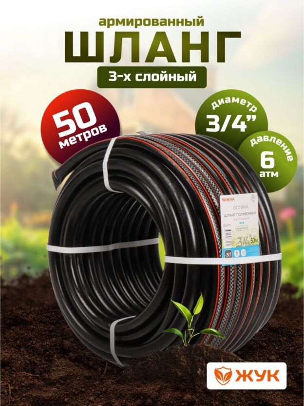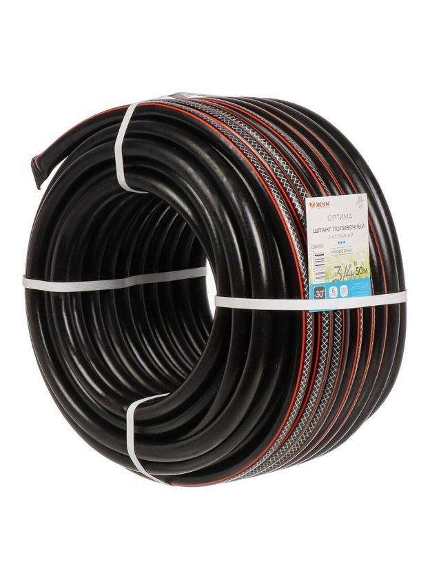 Шланг поливочный, 3/4 '', 19 мм, 6 атм, армированный, 50 м, 3 слоя, Жук, Оптима, ТЭП, 1716-00