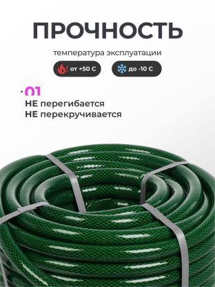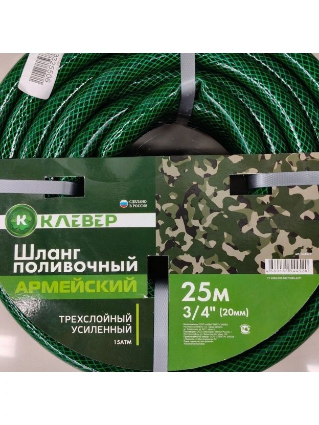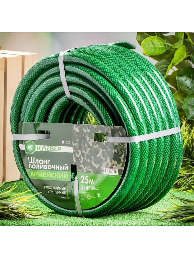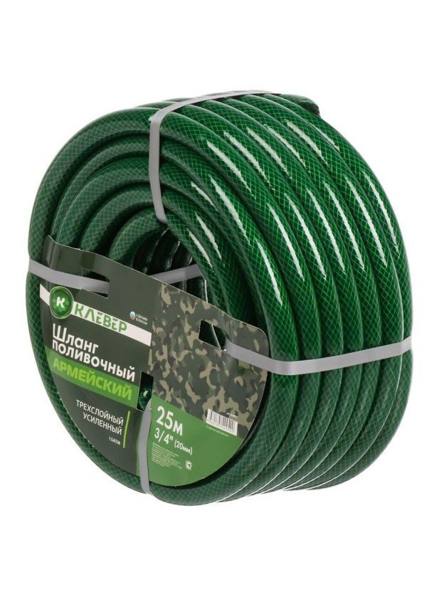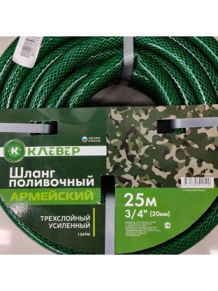 Шланг поливочный, 3/4 '', 20 мм, 15 атм, армированный, 25 м, 3 слоя, Клевер, Армейский, ПВХ, зеленый