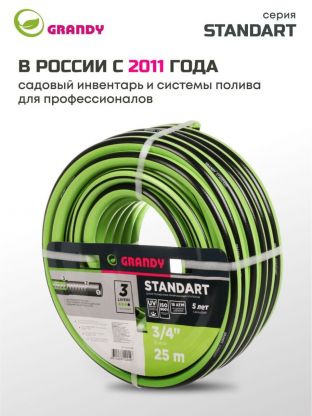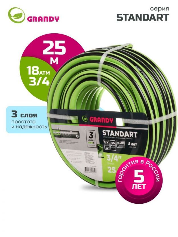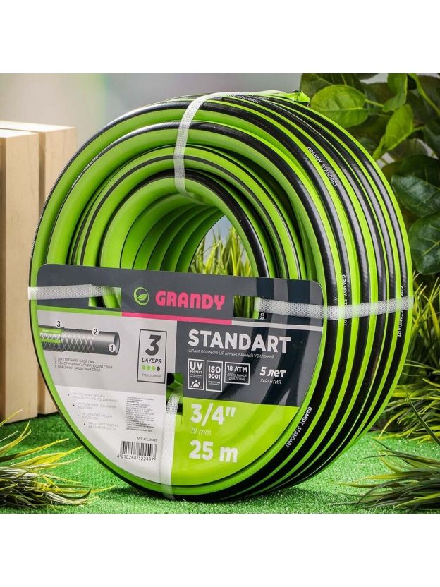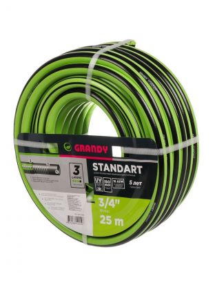 Шланг поливочный, 3/4 '', внутренний d19 мм, 18 атм, армированный, 25 м, 3 слоя, Grandy, Standart, ПВХ, AGL233425