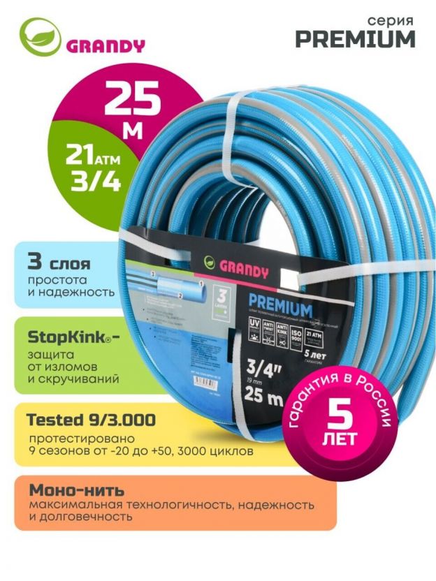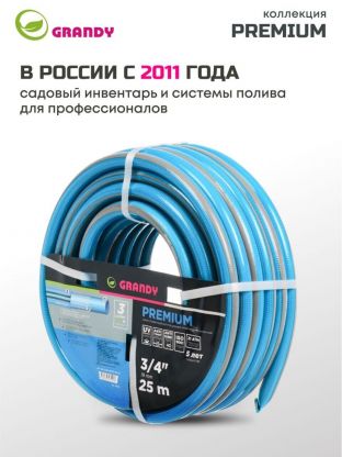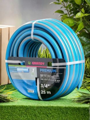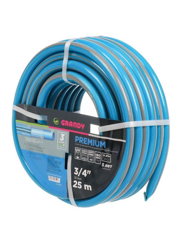 Шланг поливочный, 3/4 '', внутренний d19 мм, 20 атм, армированный, 25 м, 3 слоя, Grandy, Premium, ПВХ, усиленный, AGL123425-B/PGH-19C-25