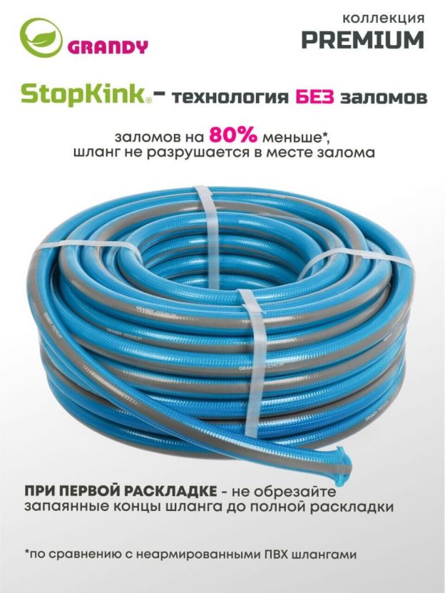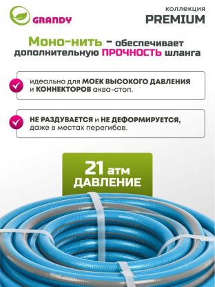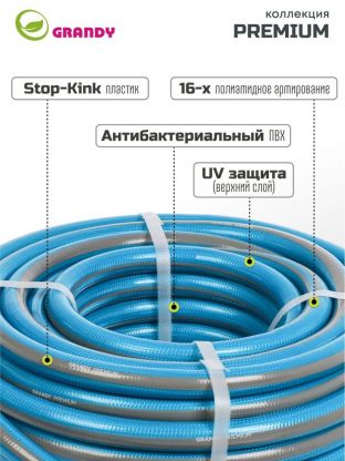 Шланг поливочный армированный Grandy Premium не подвержен локальным вздутиям, не образует трещин и изломов. Проверен на герметичность, концы шланга запаяны под давлением.